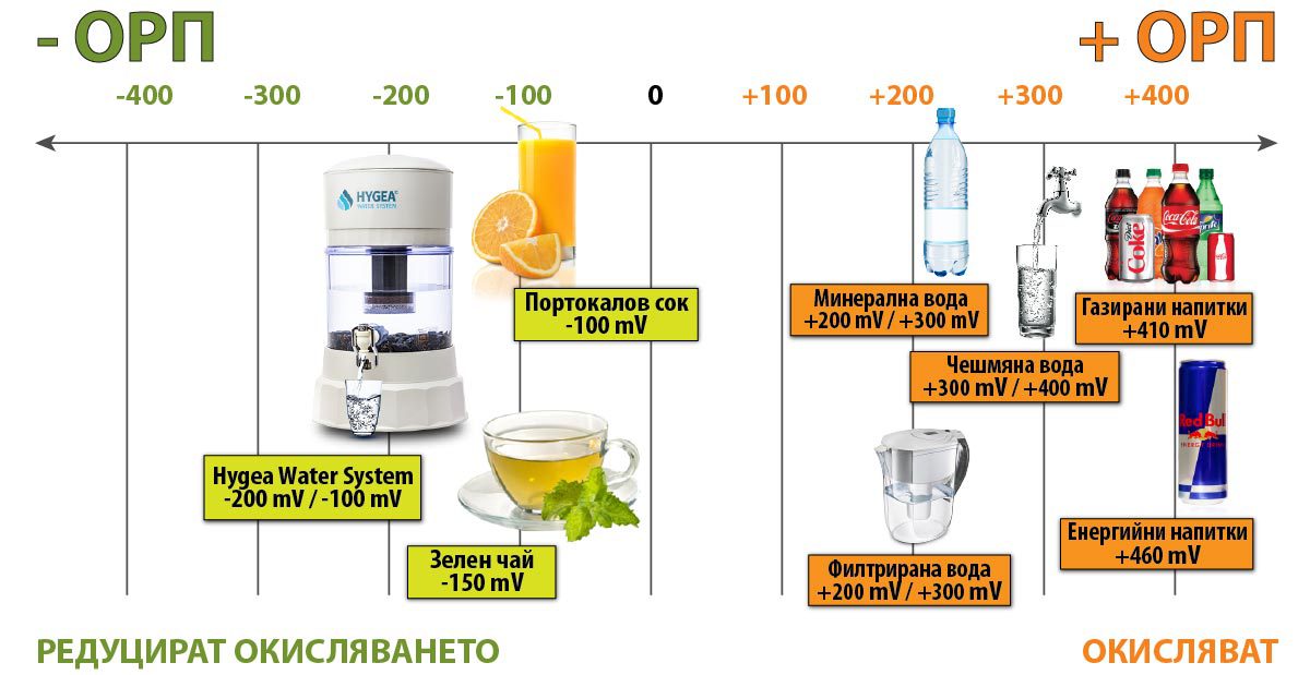 Организмът ни е изграден от около 70% вода, затова е много важно да знаем каква вода да пием всеки ден! За съжаление повечето питейна вода с АБСОЛЮТНО НИЩО не помага за нашето здраве, дори и след филтриране. ЗАЩО Е ТАКА? Много просто – защото тази вода НЕ Е АНТИОКСИДАНТ! Дали една течност е антиоксидант се определя от нейния ОКИСЛИТЕЛНО РЕДУКЦИОНЕН ПОТЕНЦИАЛ /ОРП/. ОРП измерва способността на дадено вещество да окислява, т.е. да отнема електрони или да редуцира окисляването, т.е. да дарява електрони, или това са така наречените антиоксиданти. Измерва се в миливолтове /mV/ и може да бъде положително, ако окислява, и отрицателно, ако редуцира окисляването. Тоест, колкото една течност има по-ниско ОРП, толкова тя е ПО-ПОЛЕЗНА за Вашия организъм, защото елиминира свободните радикали. Hygea Water System успява да понижи ОРП на чешмяната вода от около +400 mV / +300 mV на -200 mV / -100 mV